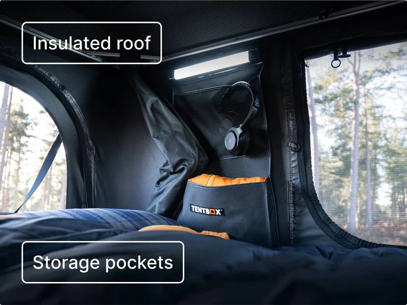 Inside, you’ll find a dual-layer mattress, deep side pockets, a large roof net, cosy roof liner, and built-in LED lighting.