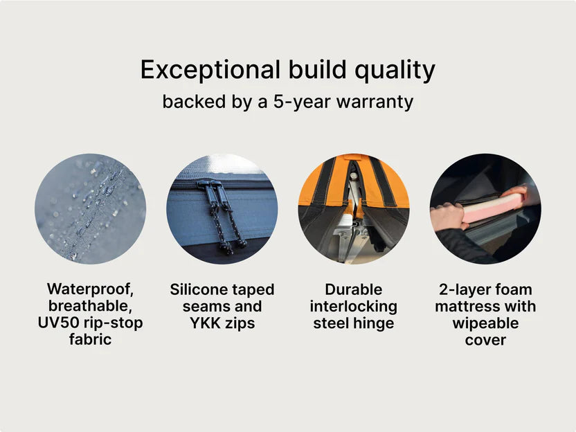 Inside, you’ll find a fitted super king mattress (that stays inside when packed down), double skylights, a removable rainfly, and a refined layout that feels roomy and comfortable.